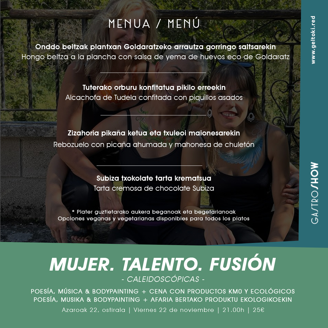 Caleidoscópicas hiru artista iruindarren proiektua da, eta hiru diziplina artistiko biltzen ditu ikuskizun berean: idazketa, kantautore musika eta bodypainting-a (azalean aplikatutako pintura artistikoa). Adierazpen artistikoa egunerokotasunaren eta iragankortasunaren edertasunaren pertzepzioa komunikatzeko bitarteko gisa erabiltzen da. Artearekin adierazten, askatzen, komunikatzen, hazten eta hedatzen gara. Gastro Show-an “Mujer. Talento. Fusión” ikuskizuna aurkeztuko dute.