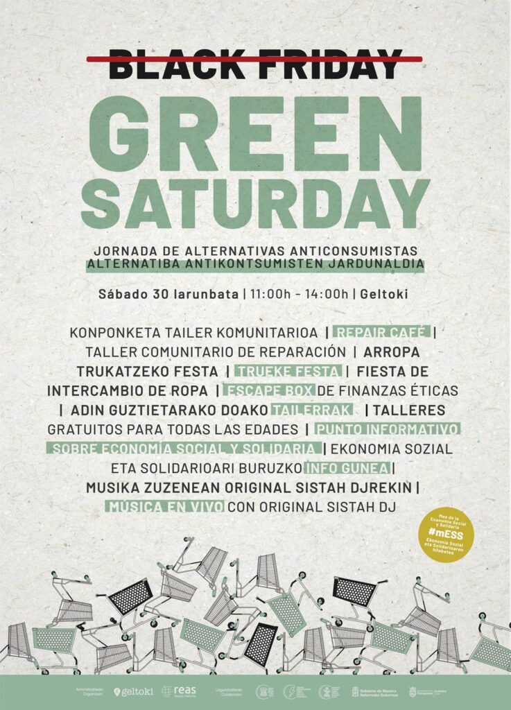 Para poner el broche final al mes de la Economía Solidaria y como contrapunto al Black Friday, una de las mayores expresiones del consumismo de estos días, organizamos un año más el evento anticonsumista Green Saturday. El evento, que se desarrolla en los andenes de la Antigua Estación de Autobuses de Iruñea en horario de 11h a 14h, cuenta con varias actividades y propuestas para reparar, recuperar y reutilizar, todas ellas gratuitas.