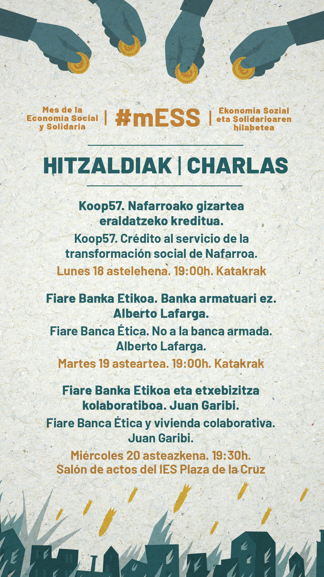 De entre las actividades que integran el programa del #mESS destacan tres charlas sobre proyectos, valores e iniciativas de banca ética organizadas para los días 18, 19 y 20 de noviembre en varias ubicaciones. El primero de estos tres encuentros se celebrará el próximo lunes, día 18, en la librería Katakrak de la calle mayor a partir de las 19:00h con Koop57 como protagonista y bajo el lema “Koop57, Credito al servicio de la transformación social en Navarra”. La segunda cita será el martes 19, tambien en Katakrak y también a partir de las 19:00h, en este caso impartida por Alberto Lafarga, de Fiare Banca Ética Navarra, sobre banca armada y el imprescindible papel que juega la banca tradicional en los conflicos bélicos a nivel internacional. La tercera y úlima charla del ciclo se realizará el miércoles 20, a las 19:30h en el salón de actos del Instituto Plaza de la Cruz, será impartida por Juan Garibi, de Fiare Banca Ética, y tratará sobre Finanzas éticas y vivienda colaborativa.